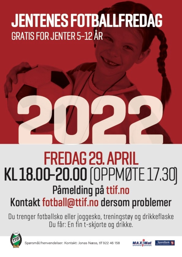 TTIF er glade for å invitere til Jentenes Fotballfredag på kunstgresset i Dærn fredag 29. april 18.00 - 20.00. Det er oppmøte 30 minutter før. Vi inviterer jenter fra hele Halden til en økt som vi håper er tilpasset de ulike aldrene godt. Ved spørsmål send mail til fotball@ttif.no og for påmelding følg denne linken.