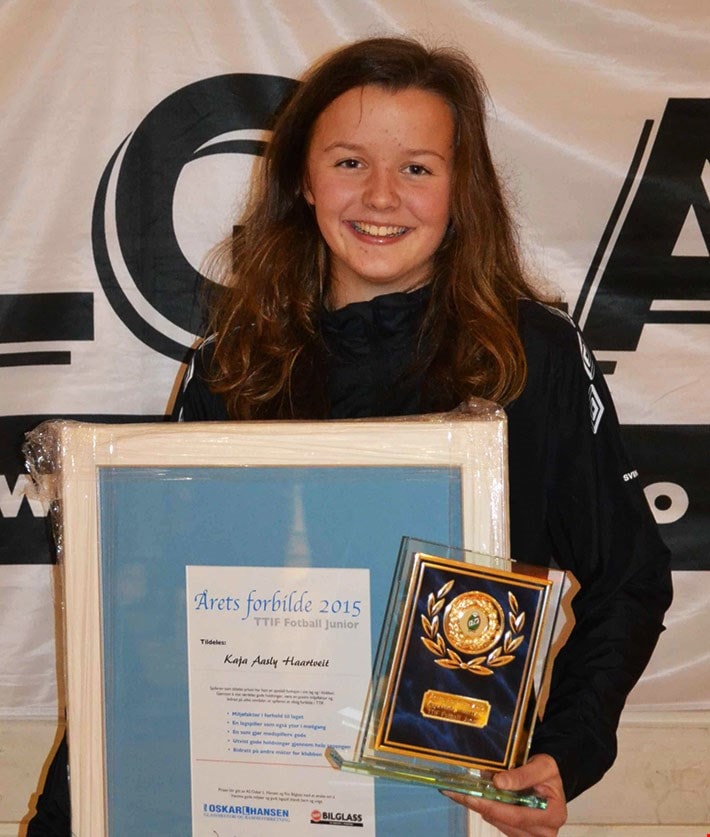 Årets forbilde blant jentene er ei jente som imponerer med sin væremåte og personlige egenskaper. Jenta har mange bein å stå på, er dønn solid, inspirer de rundt seg og sjarmerer de ho treffer. Det er noen av våre spillere som vi får hyggelig tilbakemeldinger om fra andre trenere, krets, foreldre og spillere. De positive tilbakemeldingene på denne jenta kunne vi skrevet bok om. Som spiller er jenta den som alltid går foran, den som ofrer alt og som setter laget først. Som klubbspiller er jenta alltid med på dugnad, stiller opp for jentene rundt seg og for TTIF. Spilleren har gode verdier og et hjerte av gull. Jenta har mange kvaliteter og talenter og vi forventer at ho synger takketalen. Vi er stolte av årets forbilde for jenter, Kaja Aasly Haartveit.